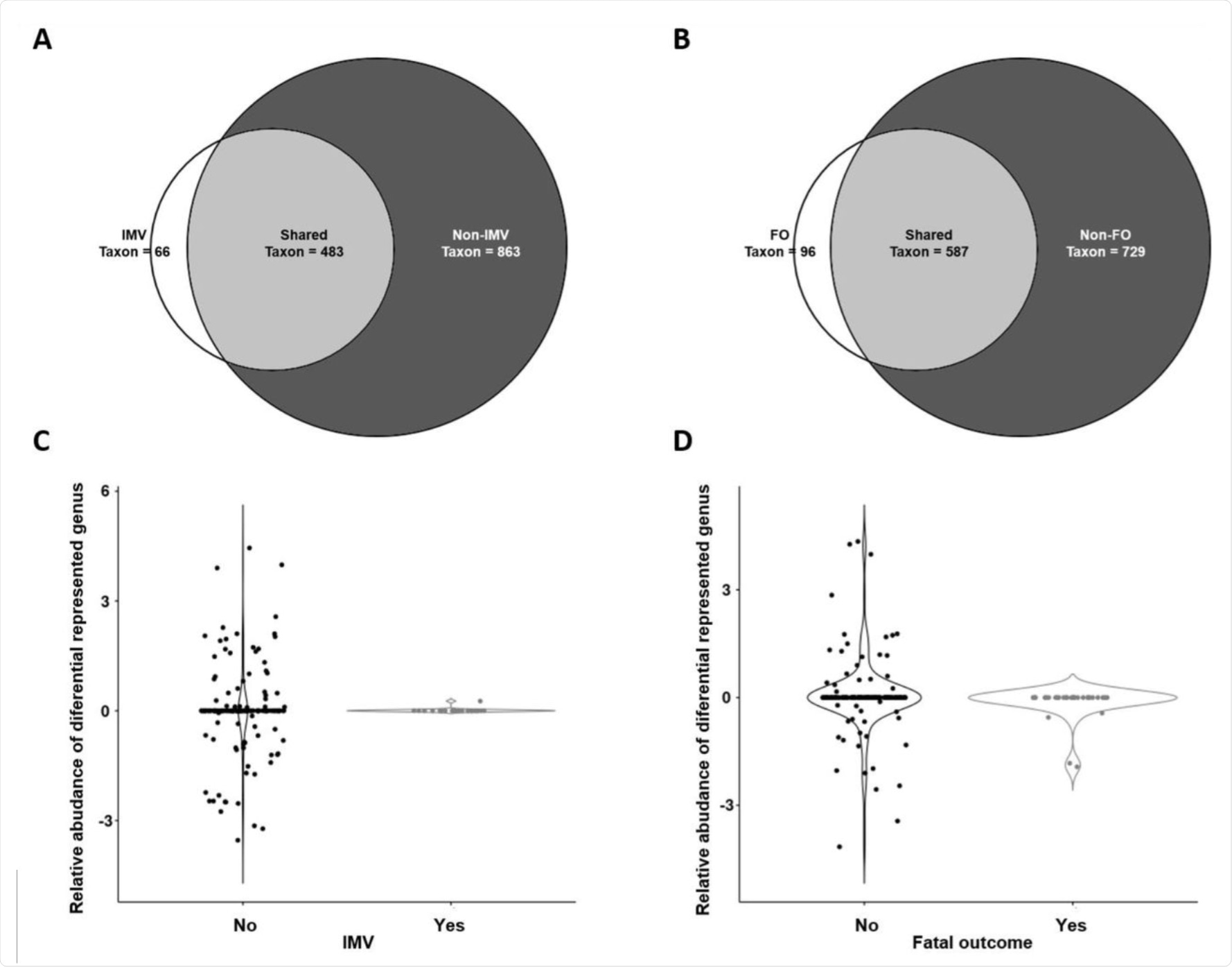Taxonomic analysis: Venn diagrams for IMV (A), and fatal outcome (B), and relative abundances of differential genera for IMV (C), and fatal outcome subpopulations (D). Relative abundances are shown in logarithmic scale. IMV: invasive mechanical ventilation, FO: Fatal outcome.