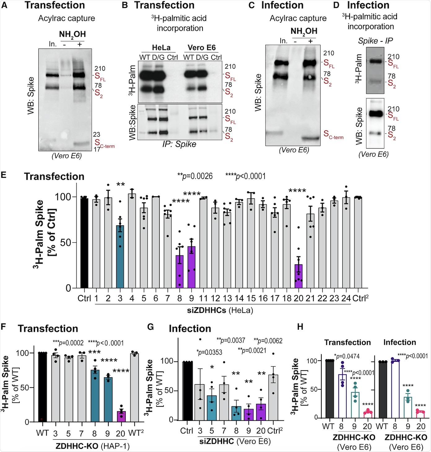 S-acylation is carried out by a family of 23 protein acyltransferases that are defined by the presence of a conserved zinc-finger domain with a DHHC motif (ZDHHCs). For identification of the enzyme that modified the S protein, all ZDHHCs were depleted in Hela cells. ZDHHC8, 20, and 9 were found to play major roles in S protein acylation.