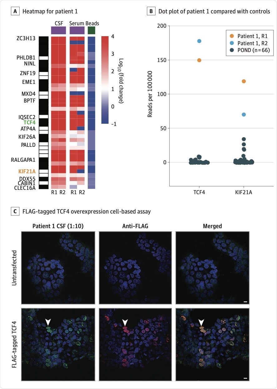 A, Heatmap of human phage display immunoprecipitation sequencing data for patient 1’s cerebrospinal fluid (CSF) and serum. TCF4 and KIF21A are highlighted in green and orange, respectively. Values represent log10(fold change) relative to the mean reads per 100 000 for bead controls. The black and white barcode on the left indicates rows of individual peptides that correspond to a given protein. B, Dot plot of patient 1’s CSF TCF4 and KIF21A peptide human phage display immunoprecipitation sequencing read counts compared with CSF from 66 pediatric patients with other neurologic diseases (POND). C, HEK 293 cell overexpression cell-based assay. Untransfected cells or cells transfected with FLAG-tagged TCF4 were immunostained with CSF (1:10) and a rabbit anti-FLAG antibody. Cells were then counterstained with anti–human IgG 488 (green) and anti–rabbit IgG 594 (red). Arrowheads indicate an example of a TCF4-overexpressing cell that was immunostained by CSF IgG. Scale bars are 10 μM. R1 and R2 indicate technical replicates 1 and 2, respectively.