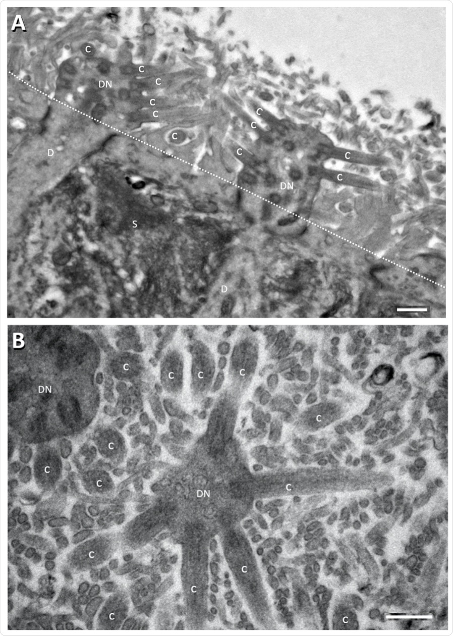 Electron micrographs showing perpendicular (A) and tangential/oblique section (B) of the apical part of the rat OE. Dotted line in panel A denotes sustentacular cell (S) apical surface from apical part of the rat OE. Dotted line in panel A denotes sustentacular cell (S) apical surface from which the long thin sustentacular-cell microvilli protrude into the nasal cavity for about 2–3 μm. which the long thin sustentacular-cell microvilli protrude into the nasal cavity for about 2–3 μm. ORN dendritic knobs (DN) and cilia (C) at apical ends of ORN dendrites (D) are mostly found ORN dendritic knobs (DN) and cilia (C) at apical ends of ORN dendrites (D) are mostly found among among the sustentacular microvilli (most of the unlabeled small profile structures in (B) and in area the sustentacular microvilli (most of the unlabeled small profile structures in (B) and in area above above the dotted line in (A). Human OE is similarly organized [52–54]. Scale bars = 0.5 μm. the dotted line in (A). Human OE is similarly organized [52–54]. Scale bars = 0.5 μm.