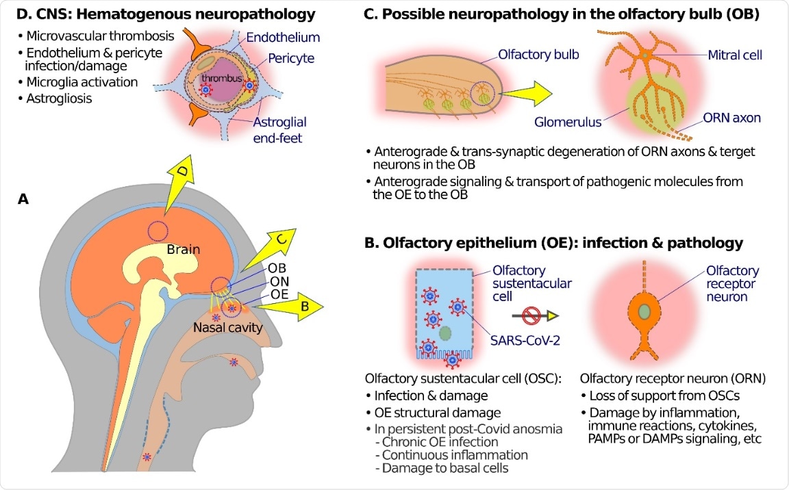 Schematic diagrams showing possible mechanisms of olfactory neuropathogenesis in COVID-19. (A) A schematic overview to illustrate relations among nasal cavity, olfactory epithelium (OE), olfactory nerve (ON), olfactory bulb (OB), and the brain (B) At the OE, SARS-CoV-2 mainly infects olfactory sustentacular cells (OSCs) that express high levels of SARS-CoV-2 receptor ACE2 on the luminal surface. Sustentacular cell infection and damage may lead to inflammation, SARS-CoV-2 receptor ACE2 on the luminal surface. Sustentacular cell infection and damage may lead to inflammation, immune reactions, release of cytokines, and signaling through pathogen-associated molecular patterns (PAMPs), damage- immune reactions, release of cytokines, and signaling through pathogen-associated molecular patterns (PAMPs), damage-associated molecular patterns (DAMPs), and pattern recognition receptors (PRRs) which in turn may cause dysfunctions associated molecular patterns (DAMPs), and pattern recognition receptors (PRRs) which in turn may cause dysfunctions (such as anosmia or hyposmia) and damage and/or anterograde degeneration of olfactory receptor neuronal cells (ORNs). In the case of post-COVID-19 persistent olfactory dysfunctions, pathogenic mechanisms may include damage of basal degeneration of neural structures in the OB. (D) SARS-CoV-2 infection of endothelial cells or pericytes, and microthrombi transport of pathogenic molecules from the OE to the OB along ORN axons may result in dysfunction and transsynaptic in capillary blood vessels, may compromise the blood–brain barrier, and give rise to hematogenous neuropathology and degeneration of neural structures in the OB. (D) SARS-CoV-2 infection of endothelial cells or pericytes, and microthrombi dysfunctions in various brain regions, including the OB. in capillary blood vessels, may compromise the blood–brain barrier, and give rise to hematogenous neuropathology and dysfunctions in various brain regions, including the OB.