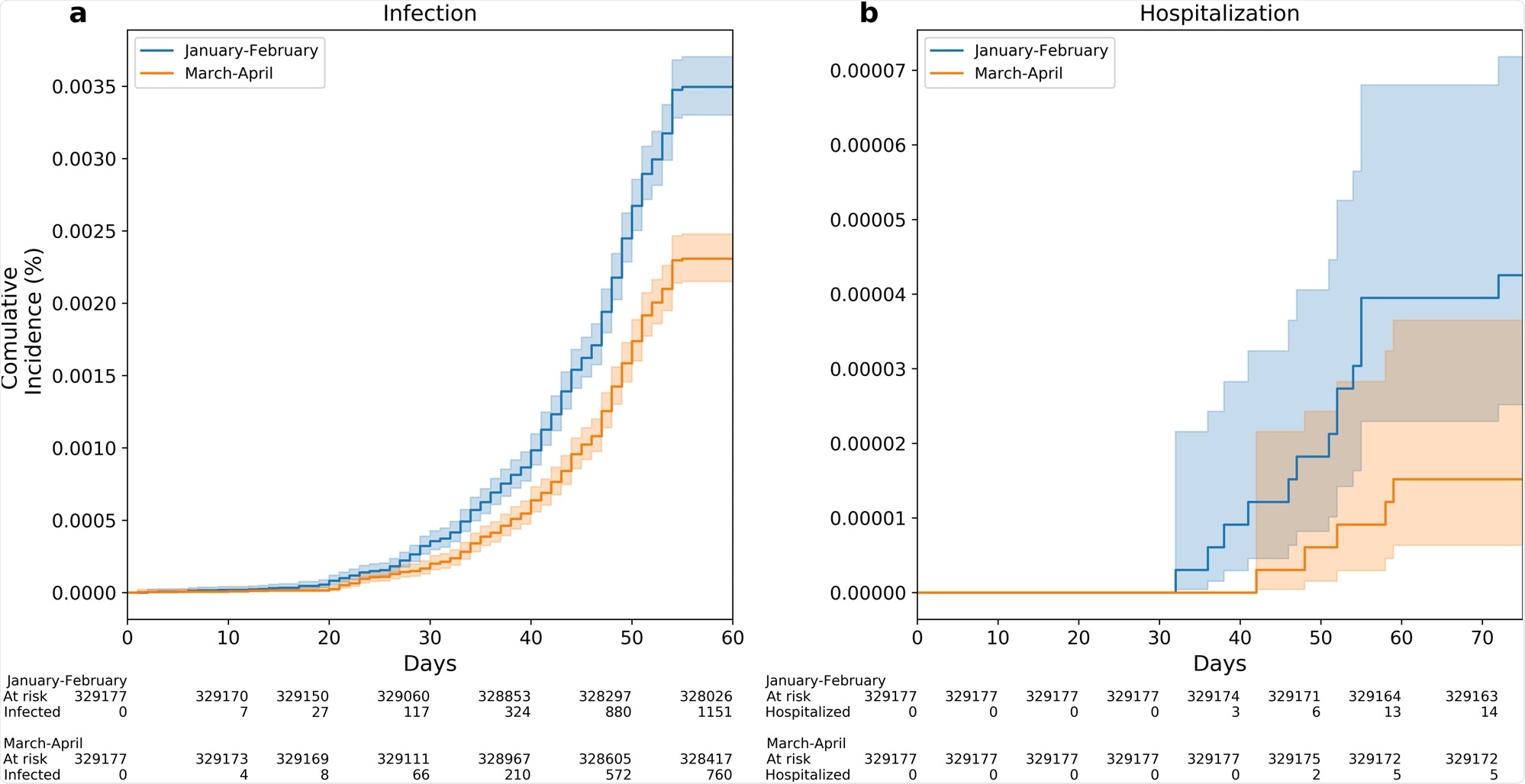 Kaplan–Meier curves are used for the accumulative probability of breakthrough infection (a) and hospitalization (b) between June and July 2021 among individuals who were vaccinated Early (January to February 2021) compared with individuals who were vaccinated late (March to April 2021). X axis in curves a, b represents days from the start of the follow-up period (June 1, 2021). Shading illustrates 95% CIs (a, b).
