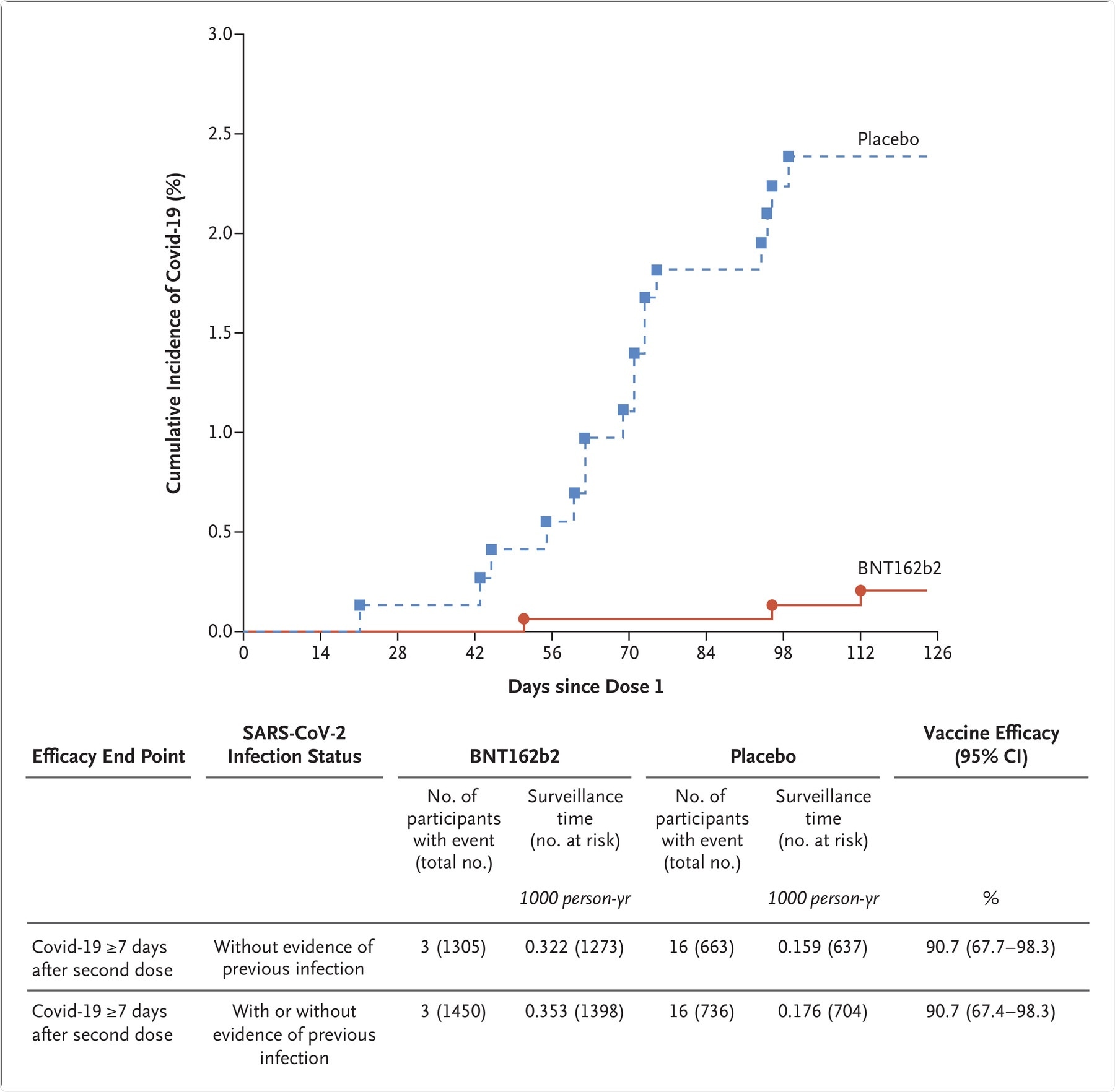 The graph represents the cumulative incidence of the first occurrence of Covid-19 after the first dose of vaccine or placebo. Each symbol represents cases of Covid-19 starting on a given day. Results shown in the graph are all available data for the efficacy population, and the results shown in the table are those for the efficacy population that could be evaluated (defined in Table S1). Participants without evidence of the previous infection were those who had no medical history of Covid-19 and no serologic or virologic evidence of past SARS-CoV-2 infection before 7 days after the second dose (i.e., N-binding serum antibody was negative at the first vaccination visit, SARS-CoV-2 was not detected in nasal swabs by nucleic acid amplification test at the vaccination visits, and nucleic acid amplification tests were negative at any unscheduled visit before 7 days after the second dose). The cutoff date for the efficacy evaluation was October 8, 2021. Surveillance time is the total time in 1000 person-years for the given end point across all participants within each group at risk for the endpoint. The time period for Covid-19 case accrual was from 7 days after the second dose to the end of the surveillance period. The 95% confidence intervals for vaccine efficacy were derived by the Clopper–Pearson method, adjusted for surveillance time.