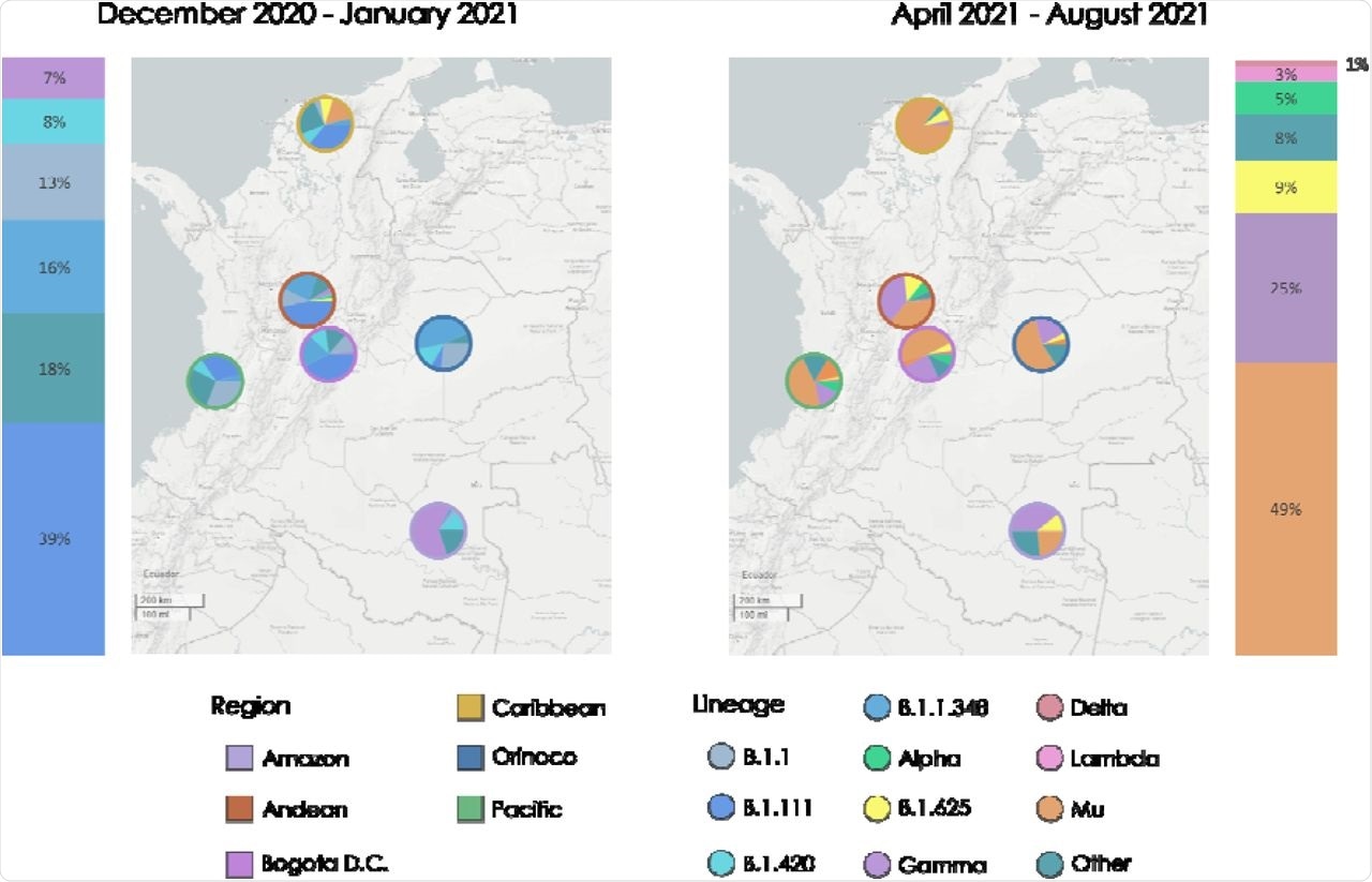 By the end of December 2020, probabilistic sampling sequences revealed a large increase in Mu and Gamma cases, which were discovered during the second peak in opposite parts of the country. The Mu variant was discovered in the Caribbean region to the north, while the Gamma variant was discovered in the Amazon to the south.