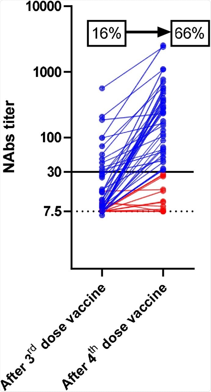 Neutralizing antibody titers against the delta variant after the third and fourth doses of the mRNA-1273 (Moderna) vaccine in 67 kidney transplant recipients. Neutralizing antibodies (NAbs) were expressed as the concentration capable of inhibiting 50% of the virus inoculum (EC50%; limit of detection: 7.5, dotted line). A titer >30 was considered as positive (black line). The percentages of patients harboring NAbs against delta variant before and after the fourth dose are shown in the graph. Lines in blue represent patients with NAbs with a titer is above 30 while red lines represent patients with NAbs with a titer is below 30.