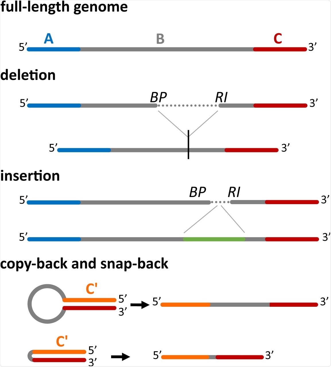 Four main classes of DI genomes can be detected by DI-tector. The full-length genome (divided here in three regions, A, B and C) is shown first. When a part of the region B is missed then DI-tector detects a deletion, if instead a region is added, DI-tector detects an insertion. Copy-backs and snap-backs are formed through junctions involving the two strands (positive-sense and negative-sense). C’ is the region complementary to C. BP: breakpoint site, RI: reinitiation site.