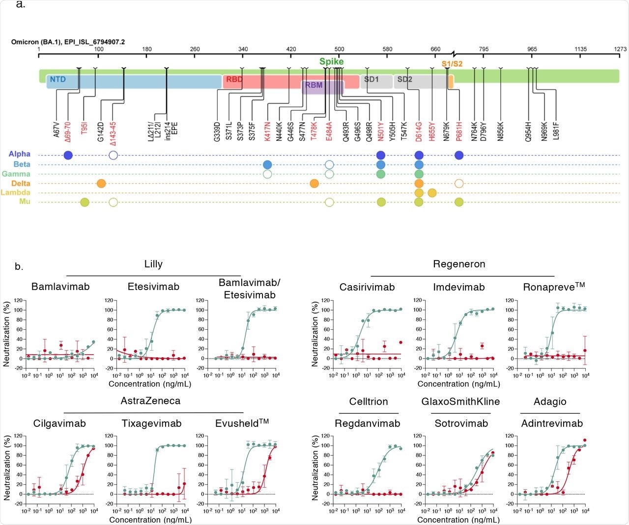 b. Neutralization curves of mAbs. Dose response analysis of the neutralization by clinical or pre-clinical mAbs (Bamlanivimab, Etesivimab, Casirivimab, Imdevimab, Adintrevimab, Cligavimab, Tixagevimab, Regdanvimab, Sotrovimab) and the indicated combinations (Bamlanivimab/Etesivimab, Casirivimab/Imdevimab [Ronapreve™], Cligavimab/Tixagevimab [Evusheld™]) on Delta (turquoise) and Omicron (red) variants. Data are mean±SD of 2 to 3 independent experiments.