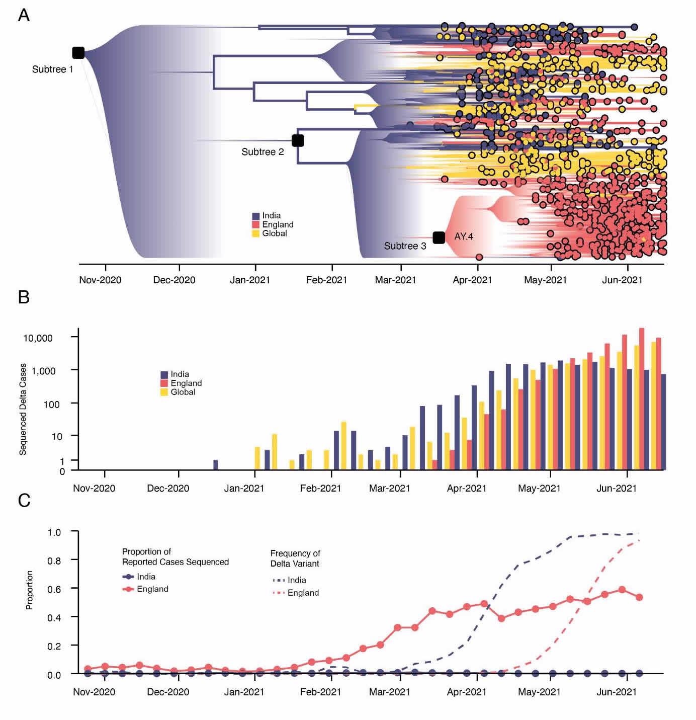 The results indicated that out of all the international introductions of the Delta variant to England, approximately half originated from India. The majority of the Delta genomes could be traced back to having been introduced before the implementation of mandatory hotel quarantine for people arriving from India.