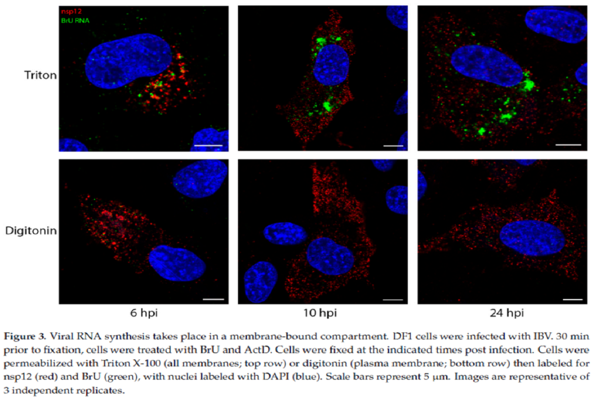 Precisely, Digitonin is a weak permeabilizing agent, which at low concentrations selectively permeabilize plasma membrane, but not intracellular membranes, while TX100 permeabilizes all cellular membranes. IBV infected chicken fibroblast DF1 cells were permeabilized with either TX100 or digitonin, then labeled with antibodies specific for non-structural protein 12 (nsp12) and dsRNA. The team had shown previously that nsp12, the viral RNA-dependent RNA polymerase (RdRp), does not colocalize with dsRNA over the course of the IBV life cycle.