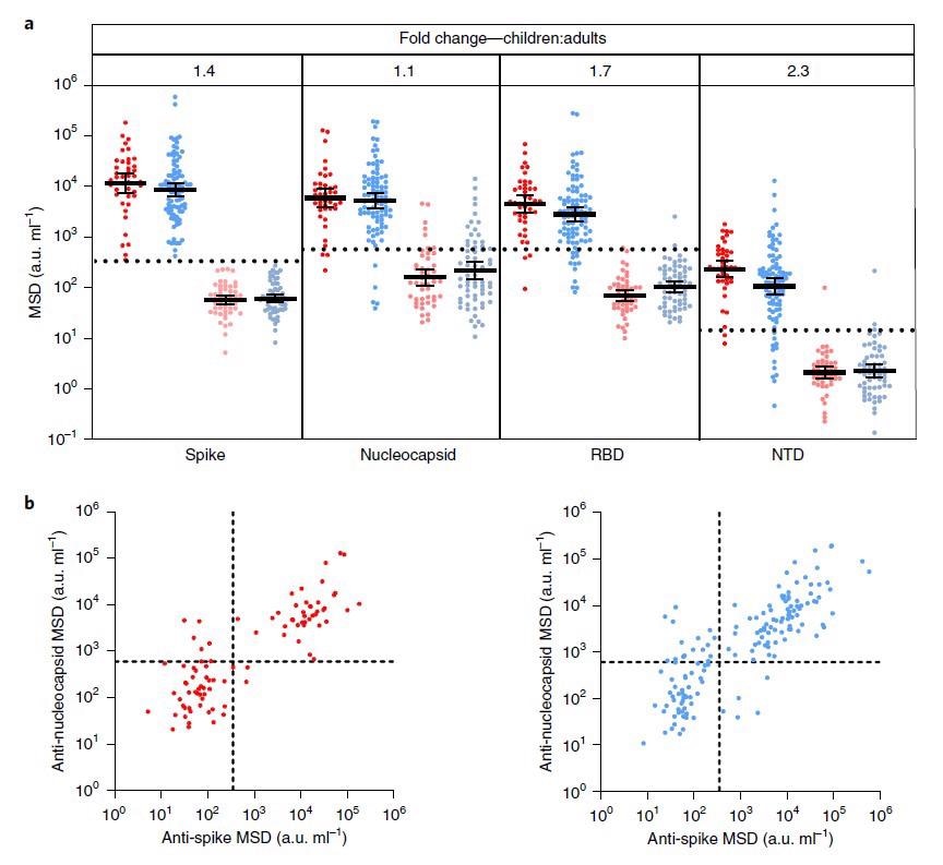 Children and adults develop coordinated antibody responses to SARS-CoV-2. a, SARS-CoV-2 antibody levels measured by MSD assay in