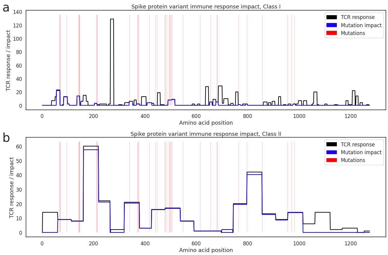 Depicting size of the Class I (a) and Class II (b) T cell response to each epitope range across the spike protein in our antigen map (black line), with positions of Omicron mutations marked in red. The blue line estimates the amount of the cellular immune response that is offtarget within each epitope window when challenged with Omicron.