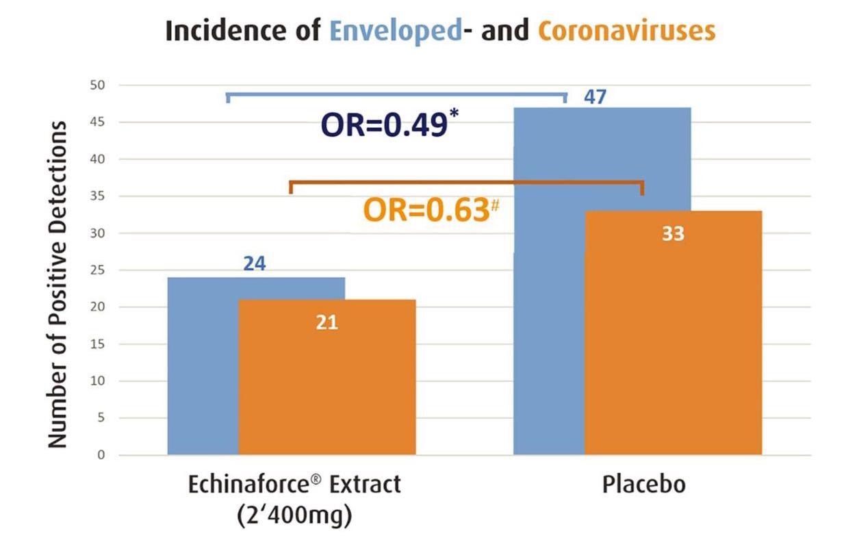 Echinacea significantly prevented enveloped virus infections (blue bar, * p=0.0114) and thereof coronaviruses 229E, HKU, NL63 and OC43 (orange bar, ♯ p>0.05) as measured by Jawad et al. 2012. Prevention of coronaviruses was significant for the ITT sub-group (p=0.010).