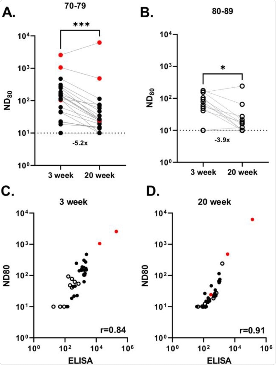 At 20-weeks post-vaccination the number of subjects who had no detectable nAbs increased to 18.2% and 30.8% in the 70-79-year-old and 80-89-year-old cohorts, respectively. Overall, the nAb titers dropped 4.9-fold between three weeks and 20 weeks post-vaccination, with 21.6% of individuals having no detectable nAbs.