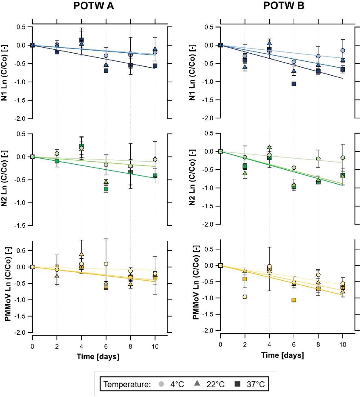 Decay curves of SARS-CoV-2 RNA (N1 and N2) and PMMoV RNA over time (days) in primary settled solids samples stored at 4, 22, and 37 °C. Left column: results from the San José-Santa Clara Regional Wastewater Facility (POTW A). Right column: results from the Sacramento Regional Wastewater Treatment Plant (POTW B). Error bars represent the standard deviation across biological replicates (n = 2).