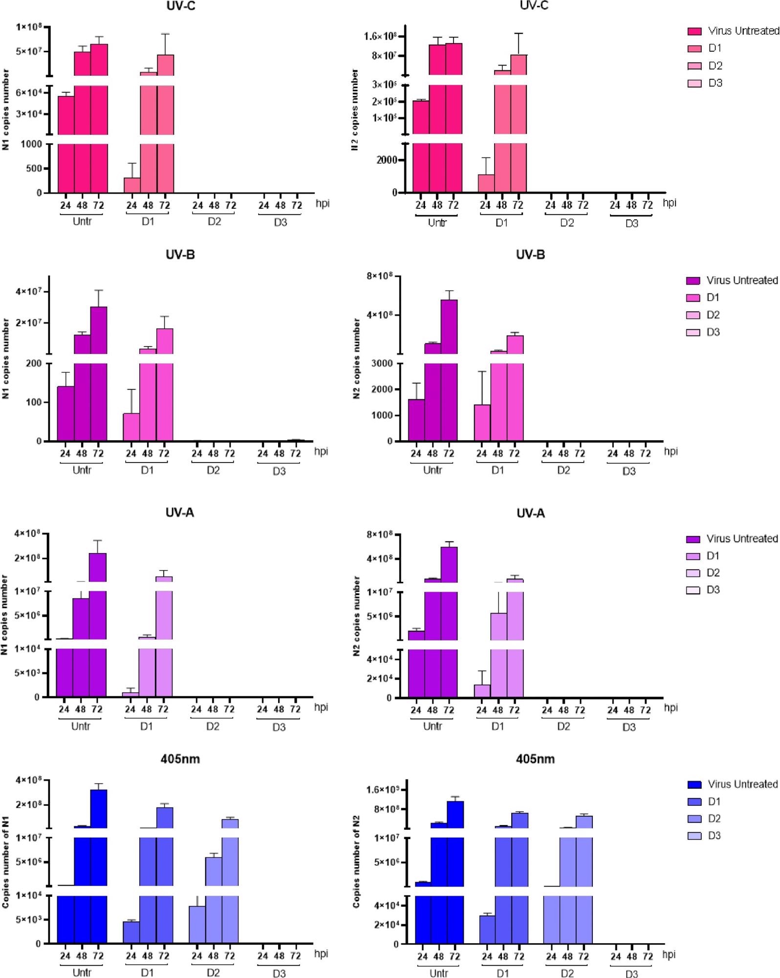 Viral replication of UV-irradiated SARS-CoV-2 (1,5 × 106 TCID50) in the supernatant of in vitro infected VeroE6 cells. Vero E6 cells were infected with SARS-CoV-2 irradiated with different doses of UV-A (D1 = 2000, D2 = 4000, D3 = 12000 mJ/cm2), -B (D1 = 100, D2 = 200, D3 = 600 mJ/cm2), -C (D1 = 2, D2 = 4, D3 = 12 mJ/cm2) and violet light (D1 = 4000, D2 = 8000, D3 = 24000 mJ/cm2). Culture supernatants were harvested at the indicated times (24, 48 and 72 hpi) and virus titers were measured by absolute copy number quantification (Real-Time PCR). All cell culture conditions were seeded in quadruplicate. Mean values ±SEM are shown.
