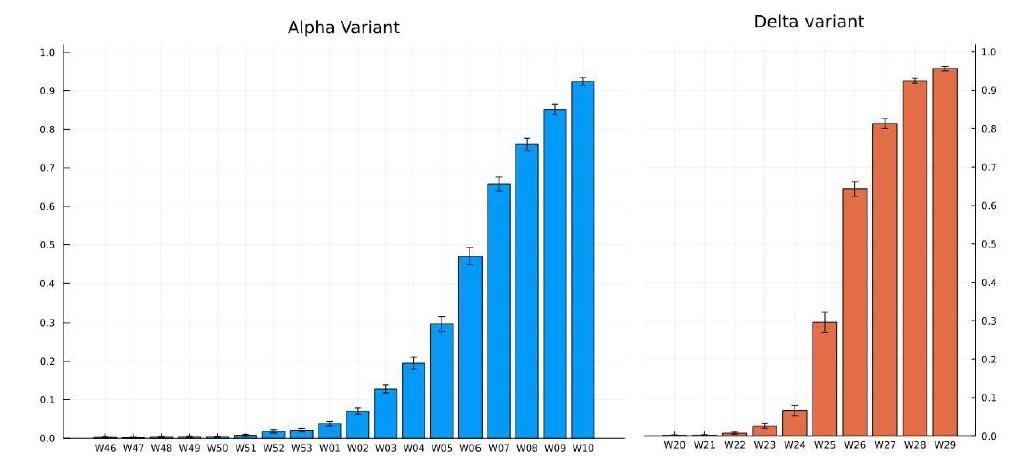 Weekly proportions of Alpha and Delta variants relative to all cases.