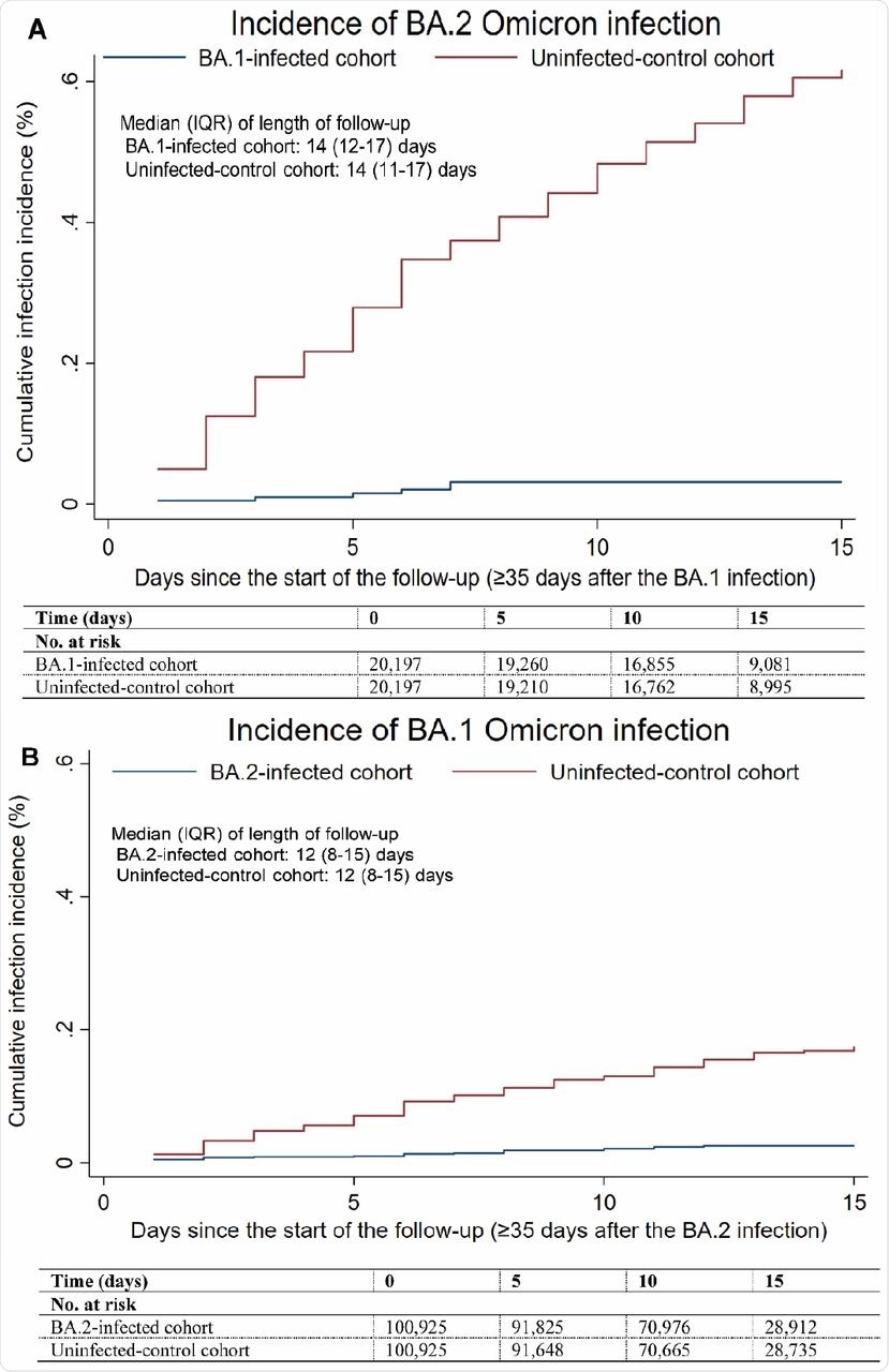 In the BA.2-against-BA.1 study, the cumulative incidence of infection was estimated to be 0.03% for the BA.2-infected cohort and 0.17% for the uninfected-control cohort 15 days after the start of follow-up. The adjusted hazard ratio for infection was estimated at 0.14, with the effectiveness of BA.2 infection against reinfection with BA.1 estimated to be 85.6%.