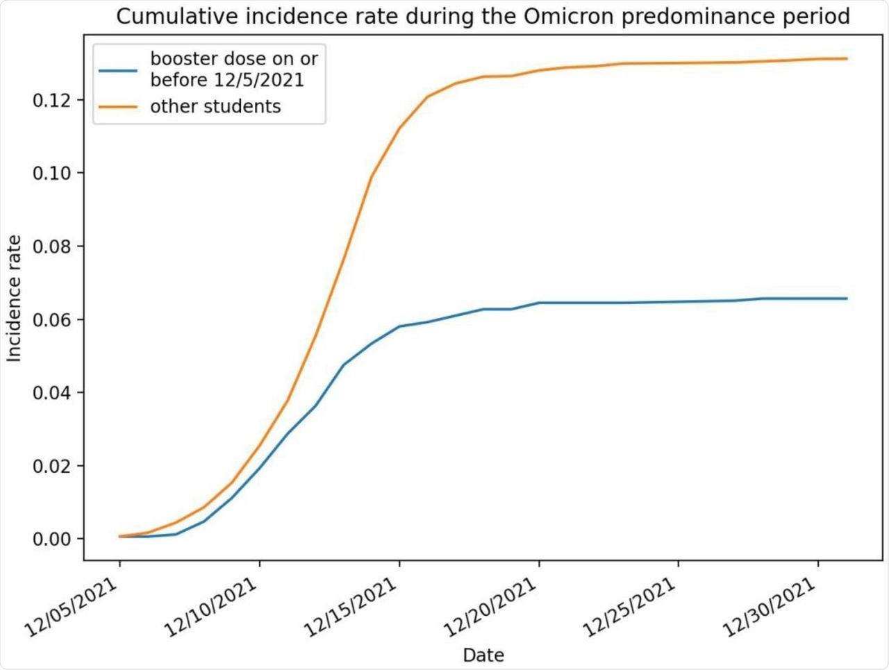SARS-CoV-2 infection cumulative incidence rate (number of infections per person) during the study period, broken out by booster dose status.