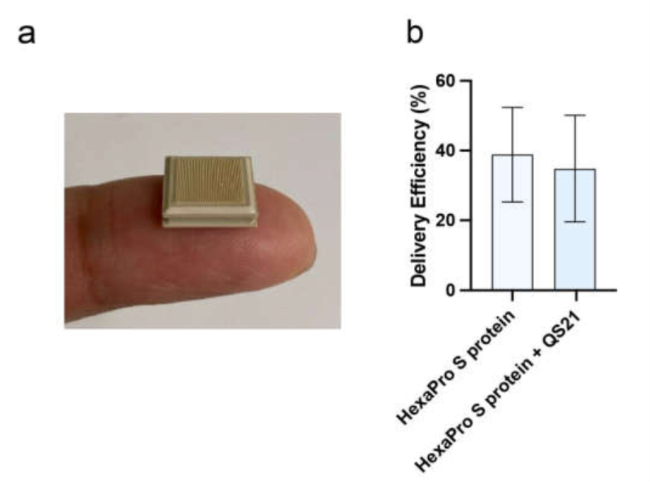 Figure 1: HexaPro S protein-based vaccine and its application using HD-MAP. (a) HD-MAPs containing 5000 solid polymer microprojection arrays to deliver vaccine into the cutaneous layer of the skin. (b) Delivery efficiency of antigen into the skin using HD-MAPs coated with SARS CoV-2 HexaPro S protein and QS-21-adjuvanted SARS CoV-2 HexaPro S protein (n = 5, each) was measured by comparing the remaining protein from the delivered HD-MAPs to undelivered HD-MAPs using capture ELISA.