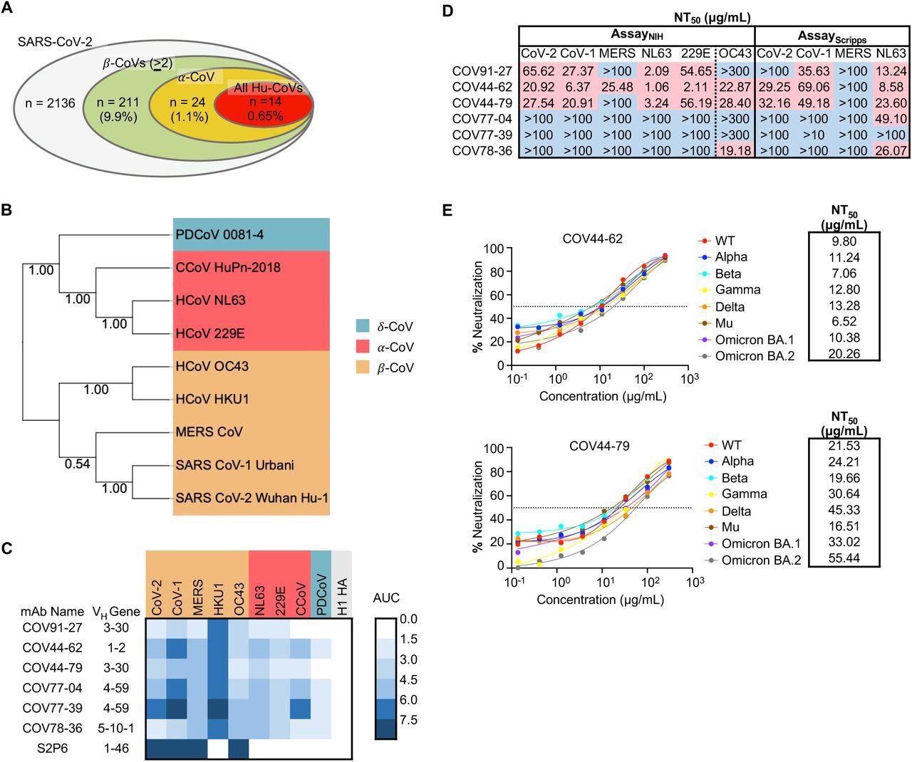 Broadly neutralizing antibodies target coronaviruses associated with human disease. (A) Analysis of the frequency of MBCs expressing broadly reactive antibodies from n = 19 donors. Values in parentheses represent the percentage of SARS-CoV-2 reactive supernatants that also bind the specified subsets of non-SARS coronavirus spikes. A total of 10,356 MBC culture supernatants (50-100 B cells/well) was screened. (B) Phylogenetic relationships across the coronavirus spike proteins targeted by the broadly reactive mAbs were inferred by the Neighbor-Joining method in MEGA11 using full-length amino-acid sequences of CoV spike proteins. Bootstrap values from 500 samplings are shown on the branches. (C) Heat map representing the binding of broadly reactive mAbs to spike proteins from coronaviruses across the alpha, beta and deltacoronavirus genera. H1 hemagglutinin was included as a negative control for mAb binding experiments and area under the curve (AUC) values for each antigen are shown after subtraction with values for the negative control antigen CD4. (D) Values represent antibody titer at 50% neutralization (NT50) against SARS-CoV-2 Wuhan Hu-1, SARS-CoV-1, MERS-CoV, HCoV-NL63 and HCoV-229E envelope-pseudotyped lentivirus, as well as authentic HCoV-OC43. NT50 values were calculated using the dose-response-inhibition model with 5-parameter Hill slope equation in GraphPad Prism 9. (E) Neutralization of SARS-CoV-2 variants of concern (pseudovirus) by COV44-62 and COV44-79.