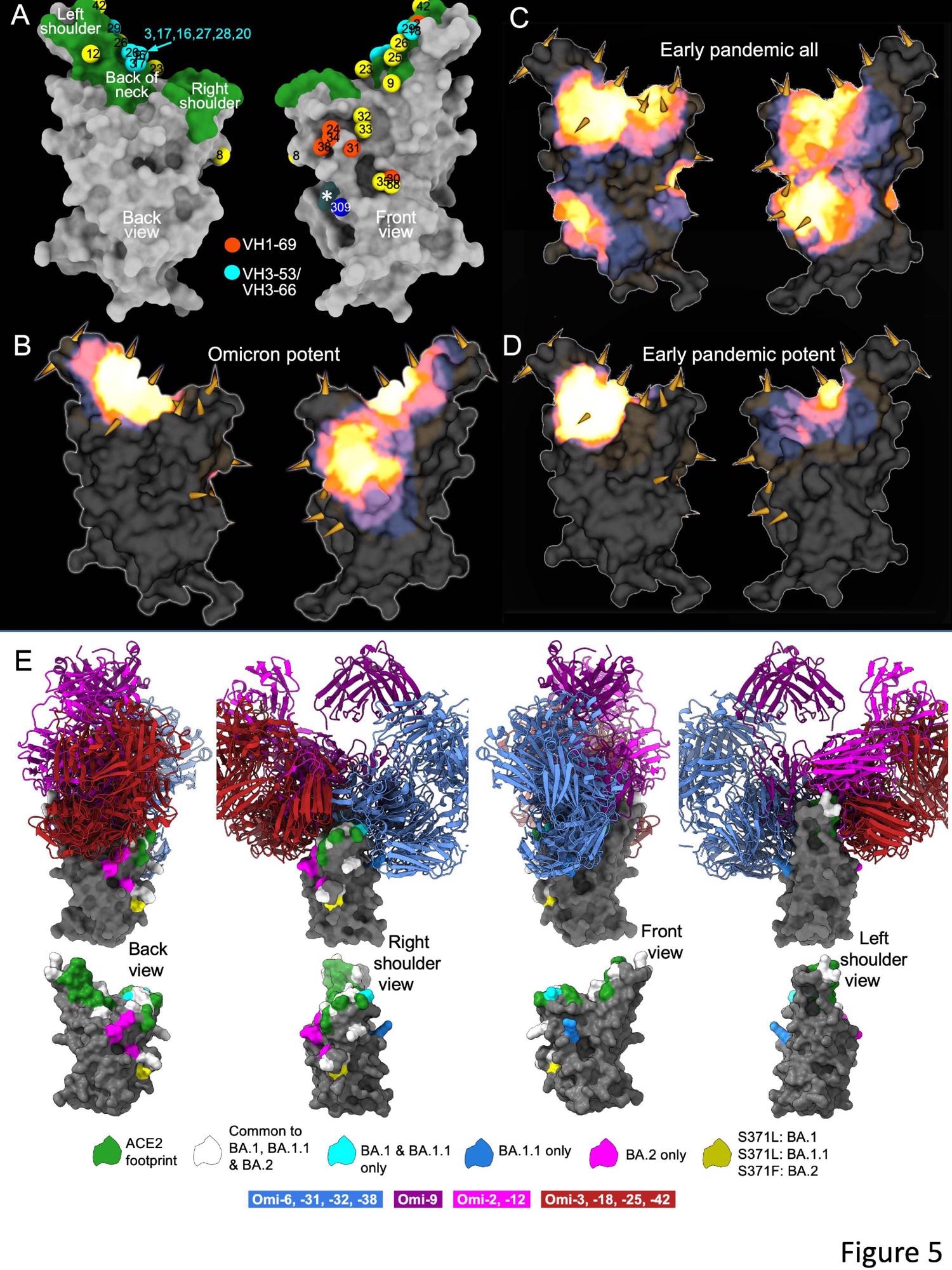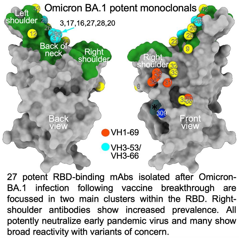 The Omicron mAb set had around one-half of the gene families observed in the potent early pandemic antibodies. Although IGHV1-69 did not feature in the set of potent early antibodies, there were six IGHV1-69 antibodies in 27 potent RBD binding mAbs. The authors also noted higher levels of somatic mutation in both heavy and light chains of Omicron mAbs relative to the early pandemic set of antibodies.
