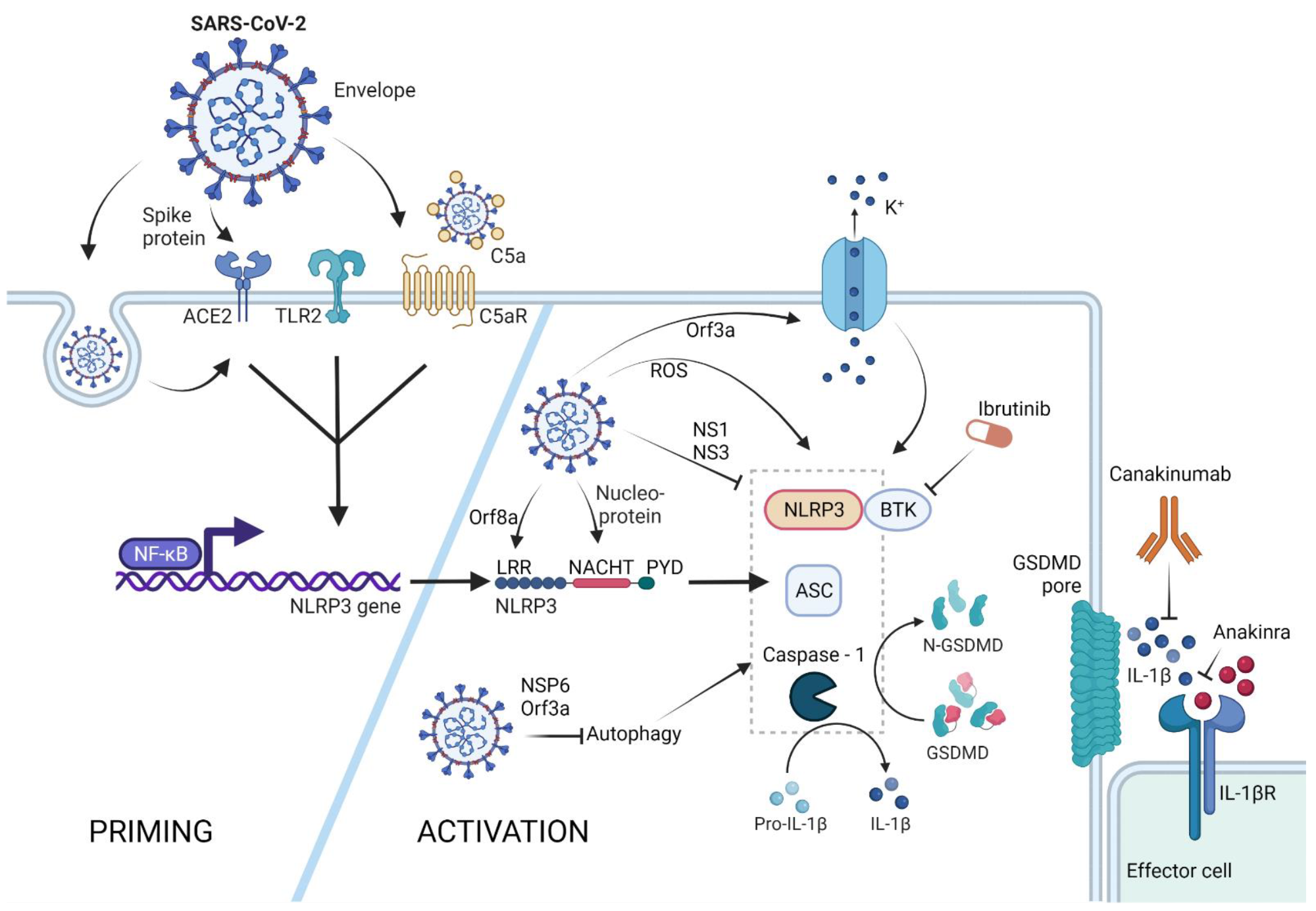 Several in vitro and in vivo studies have revealed that the SARS-CoV-2 spike and envelope proteins prime the NLRP3 inflammasome. Furthermore, SARS-CoV-2 infection upregulates the expression of the angiotensin-converting enzyme 2 (ACE-2) receptor, which subsequently initiates nuclear factor κB (NF-κB)-mediated NLRP3 gene transcription and translation.