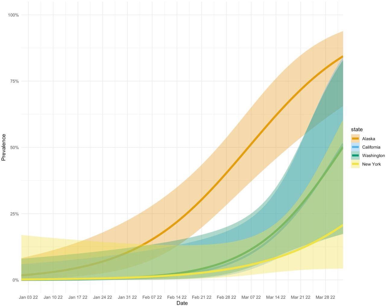Soon after, BA.2.3 cases significantly increased in Alaska to 45.3% as compared to the Lower (6.1%), New York (5.5%), Washington (17.6%), and California (16.2%). This difference in prevalence highlights the divergent patterns of BA.2.3.