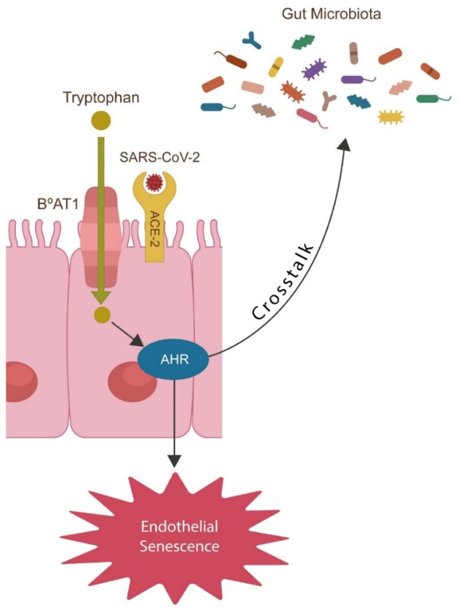 The blood-brain barrier and the gut barrier can be disrupted by senescent endothelial, which leads to the translocation of microbes and molecules of the GI tract into the systemic circulation, as observed in critical COVID-19 patients. Additionally, the S protein can bind to the LPS directly, leading to hyperinflammatory pathology.