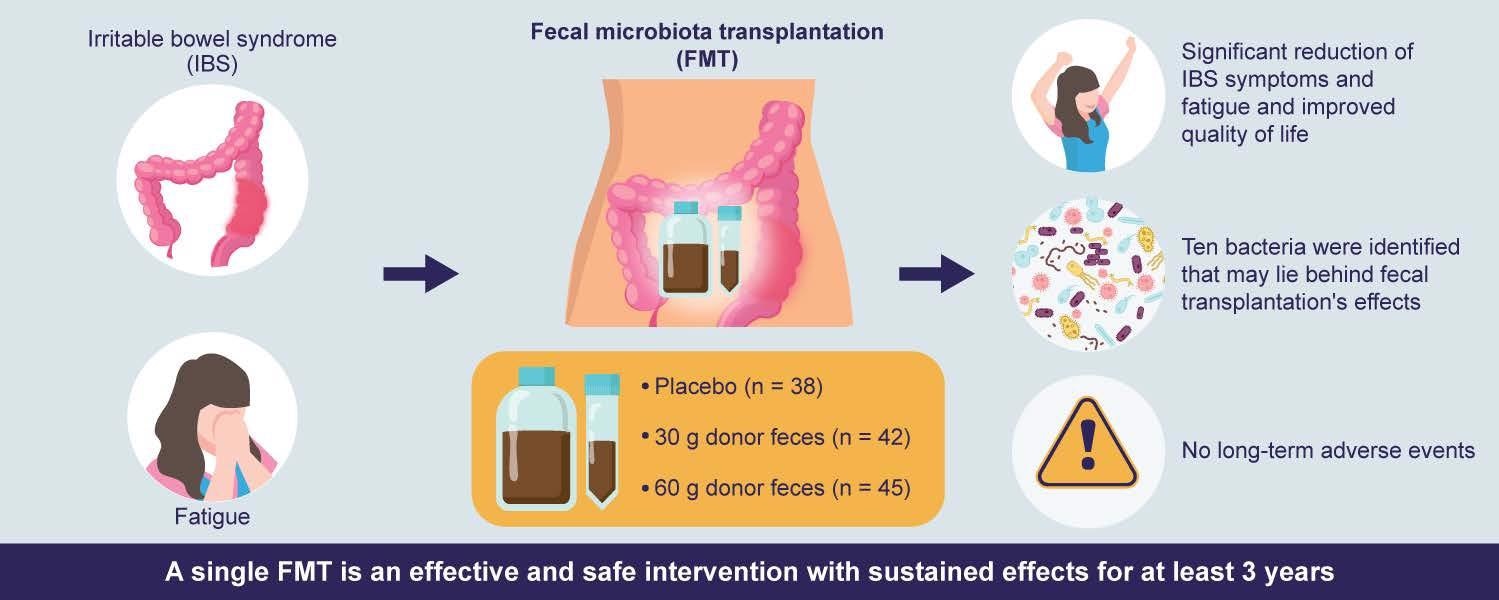 In the current study, FMT was associated with a sustained benefit for up to three years after the procedure was performed. More specifically, abdominal symptoms and fatigue improved with a corresponding increase in the quality of life. Furthermore, the proportion of severe IBS was significantly lower at two and three years following the FMT.