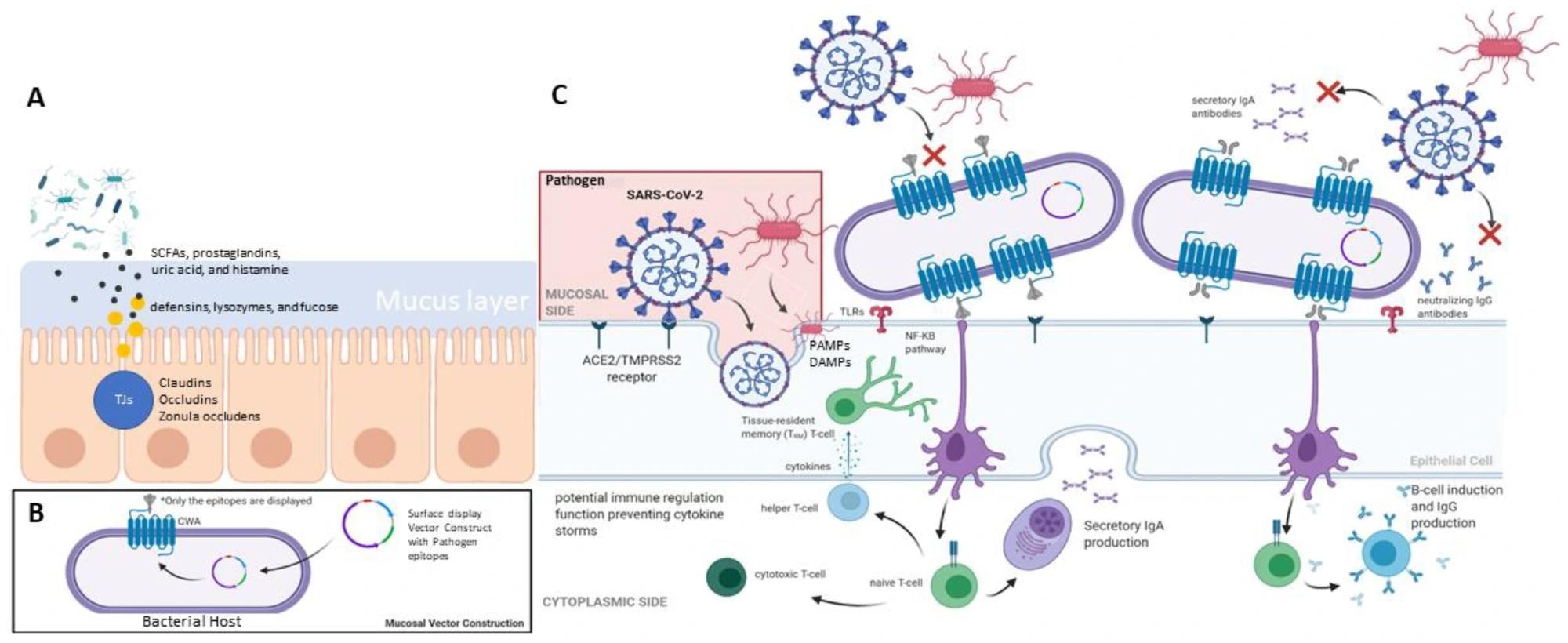 Summary of mucosal-associated immunity in human (A) gut barrier system, (B) mucosal vector construction, and (C) the mucosal response elicited by immune cells.Summary of mucosal-associated immunity in human (A) gut barrier system, (B) mucosal vector construction, and (C) the mucosal response elicited by immune cells.