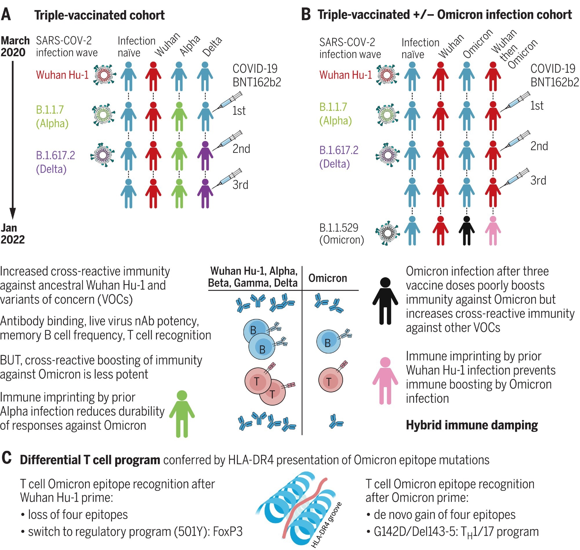 The current study demonstrated that prior infection with both Wuhan Hu-1 and Alpha variants in vaccinated individuals actually has a negative effect on their subsequent protective immunity against Omicron infection. These findings support a process known as “hybrid immune damping,” wherein specific imprinted patterns of vaccination and infection reduce protection against future infection.