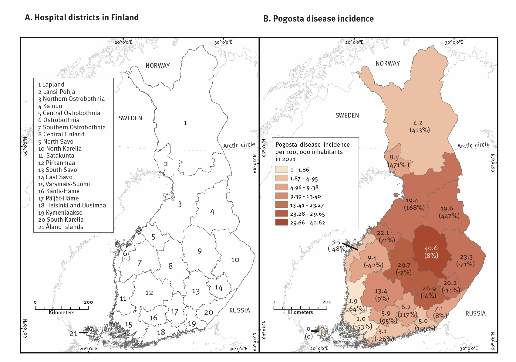 In 2021, the incidence of Pogosta disease in various hospital districts ranged from 0 on land Islands to 40.6 in North Savo per 100,000 inhabitants. Most of these cases were reported in hospital districts in central, eastern, and western Finland.