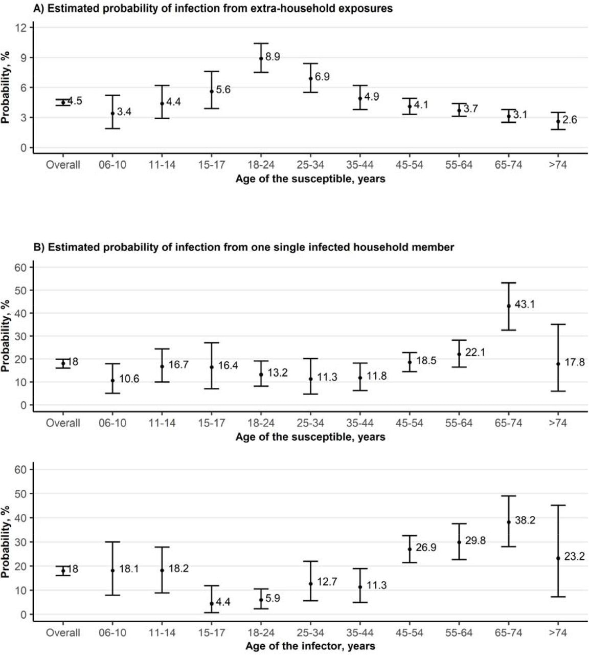 Young adults had the highest risk of extra-household infection, whereas 65-74-year-olds were at the highest risk of contracting COVID-19 from an infected person at home at a rate of 22.1%. Surprisingly, this high risk was not observed in family members aged more than 74 years.