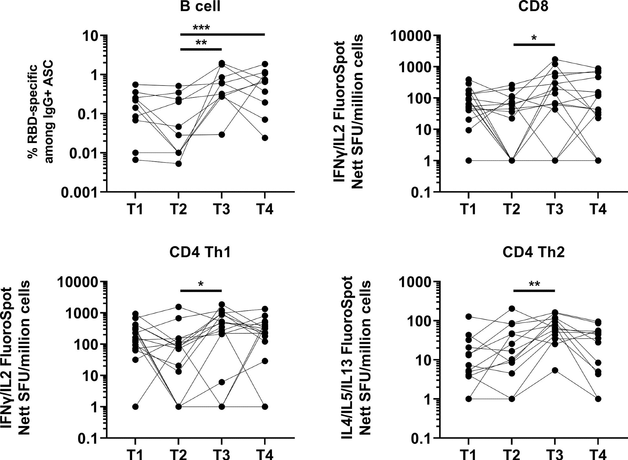 Induction and waning of memory B and T cell response against Spike following booster vaccination. RBD-specific memory B (N=10), Spike-protein-specific CD8 (N=16), CD4 Th1 (N=16) or CD4 Th2 (N=13) responses. The frequency of IgG RBD-specific memory B cells among total IgG antibody-secreting cells (ASCs) is presented for memory B cell response. For CD8, CD4 Th1, and CD4 Th2 responses, data presented are spot forming units (SFU) per million PBMC from paired samples at four time points. Each data point represents the normalized mean spot count from duplicate wells after subtraction of medium-only control. To compare between time points, Friedman tests and post hoc tests using Dunn’s multiple comparison tests were used. *, P-value <0.05; **. P-value <0.01; ***, P-value <0.001.