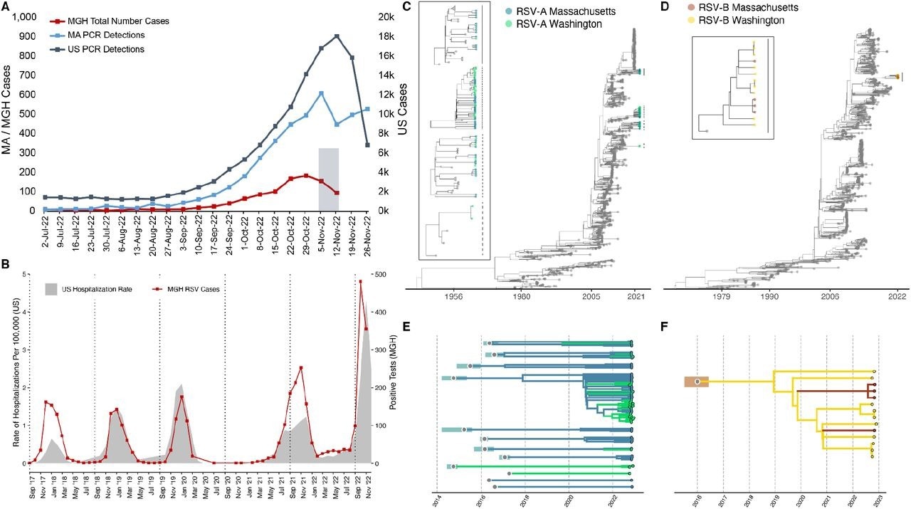 In addition, phylogenetic analysis was performed, and a maximum likelihood tree was constructed to identify genetic clades. To assess the epidemiological and genomic trends of the 2022 RSV upsurge, the number of (PCR)-positive test reports for RSV documented by the US CDC (Centers for Disease Control and Prevention) in Massachusetts and the number of RSV-positive test reports documented at the Massachusetts General Hospital were assessed.