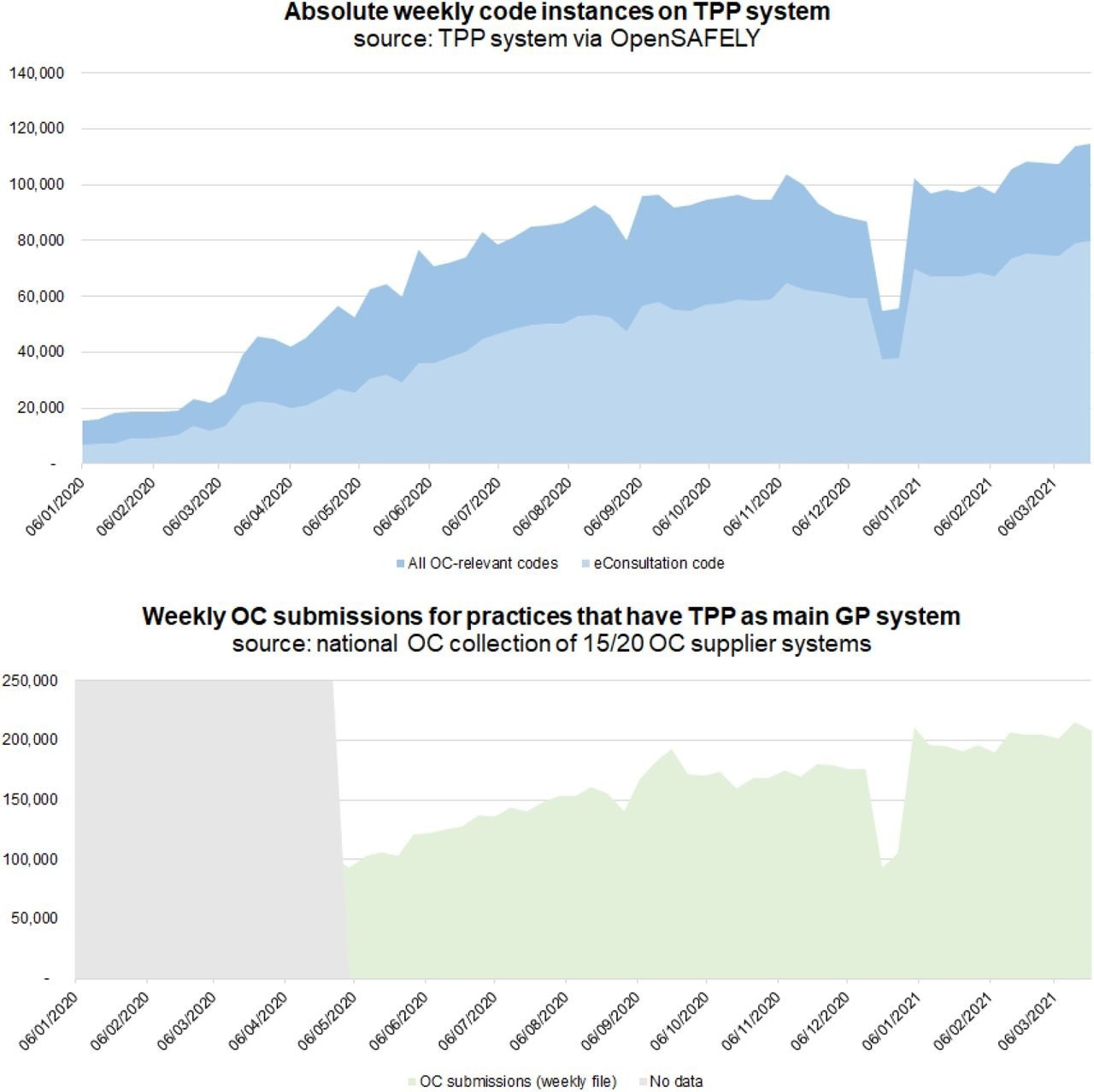 Top: absolute weekly online consultation code instances in TPP System (source: OpenSAFELY-TPP). Bottom: weekly OC submissions for practices that have TPP as main GP system (source: national rapid collection. TPP practices were identified via the POMI data collection6. Between 66-132 practices each week had no clear system associated in POMI and were not included.