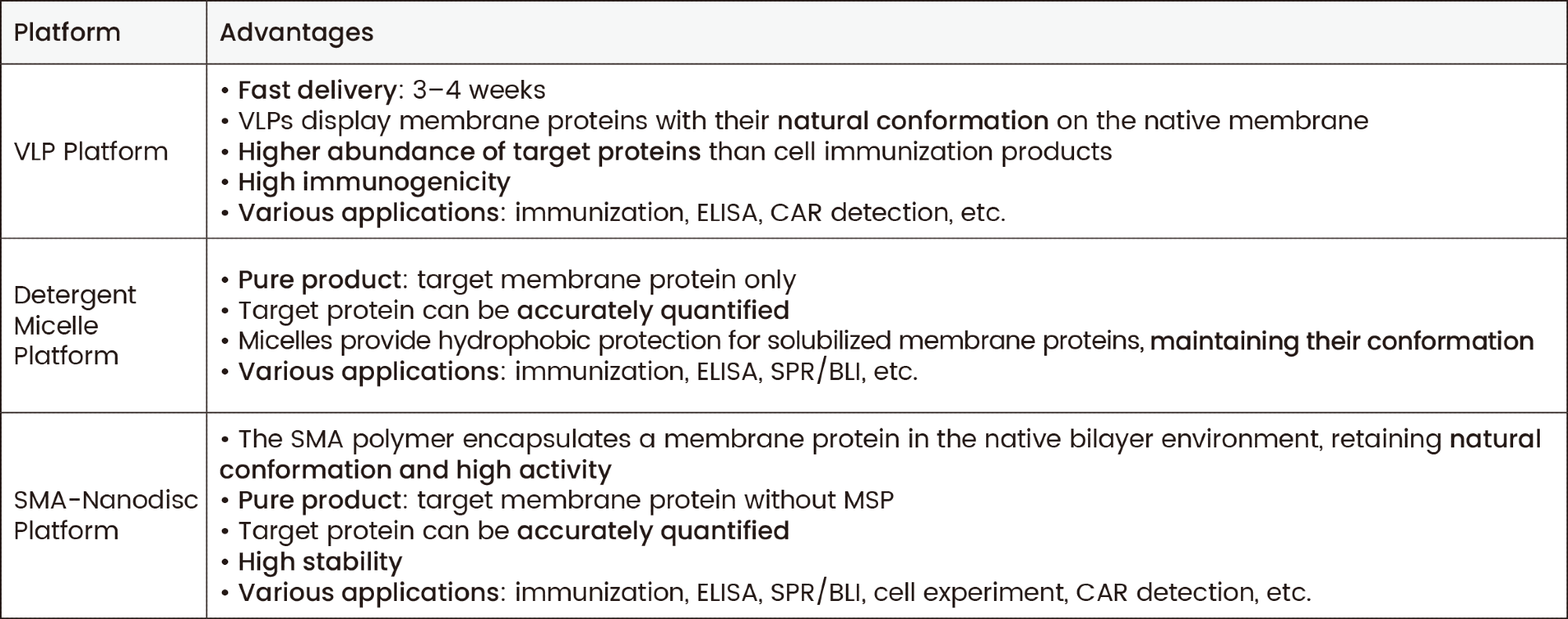 Table 1. Advantages of VLP, detergent micelle, and SMA-nanodisc platforms. Sino Biological