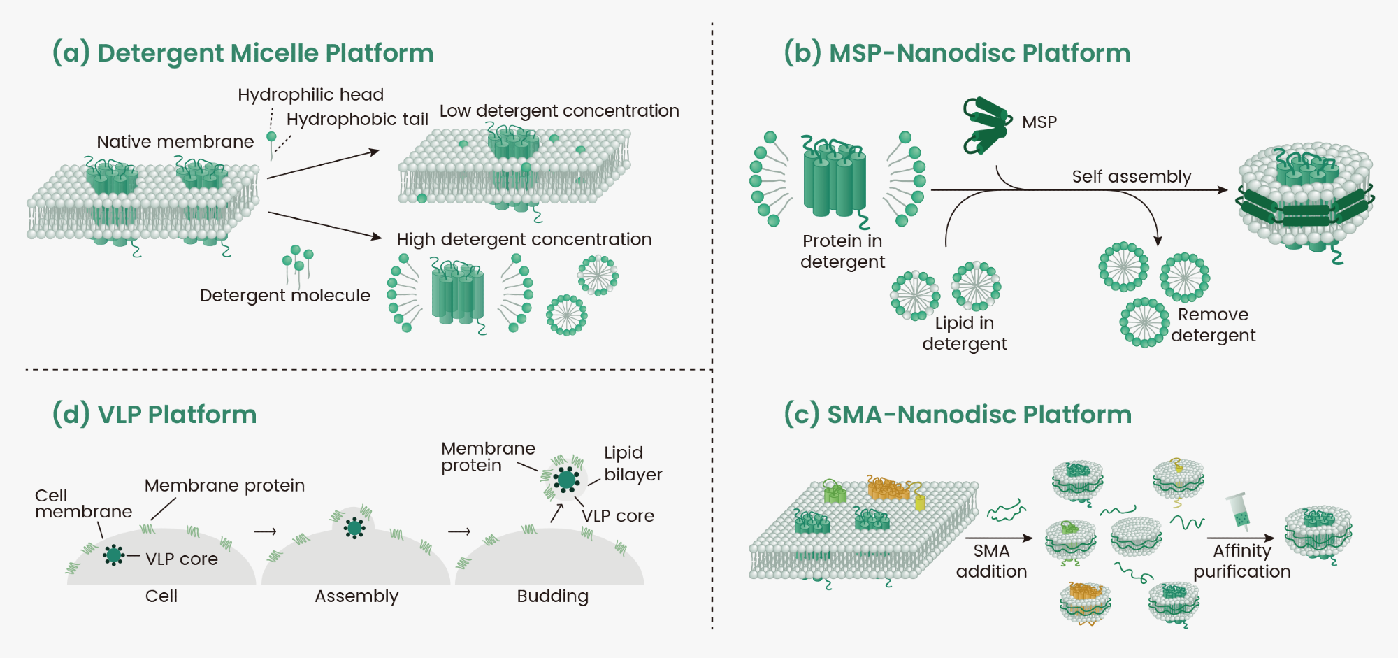 Figure 1. Schematic diagram of detergent, nanodisc, and VLP platforms. Image Credit: Sino Biological Inc.