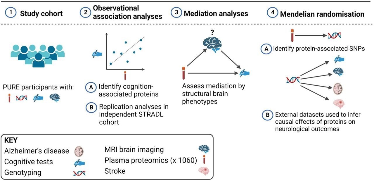 Samples obtained from PURE study participants were used to detect protein quantitative trait loci (pQTLs) for Mendelian randomization analyses, whereas PURE-MIND data were used for observational association analyses. The replication of the observational findings was sought in the Generation Scotland (GS) cohort.