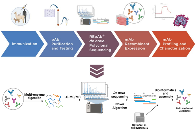Utilizing polyclonal antibody sequencing with REpAb technology provides an antibody discovery avenue that can accelerate the discovery process. Following immunization, the discovery process immediately starts off with highly abundant and functionally significant antibodies collected in serum. Utilizing a proteomics-based approach allows for antibody sequencing, followed by recombinant expression, to perform characterization and biophysical analyses. This approach negates the need for cell sorting, immortalization, and purification prior to characterization.