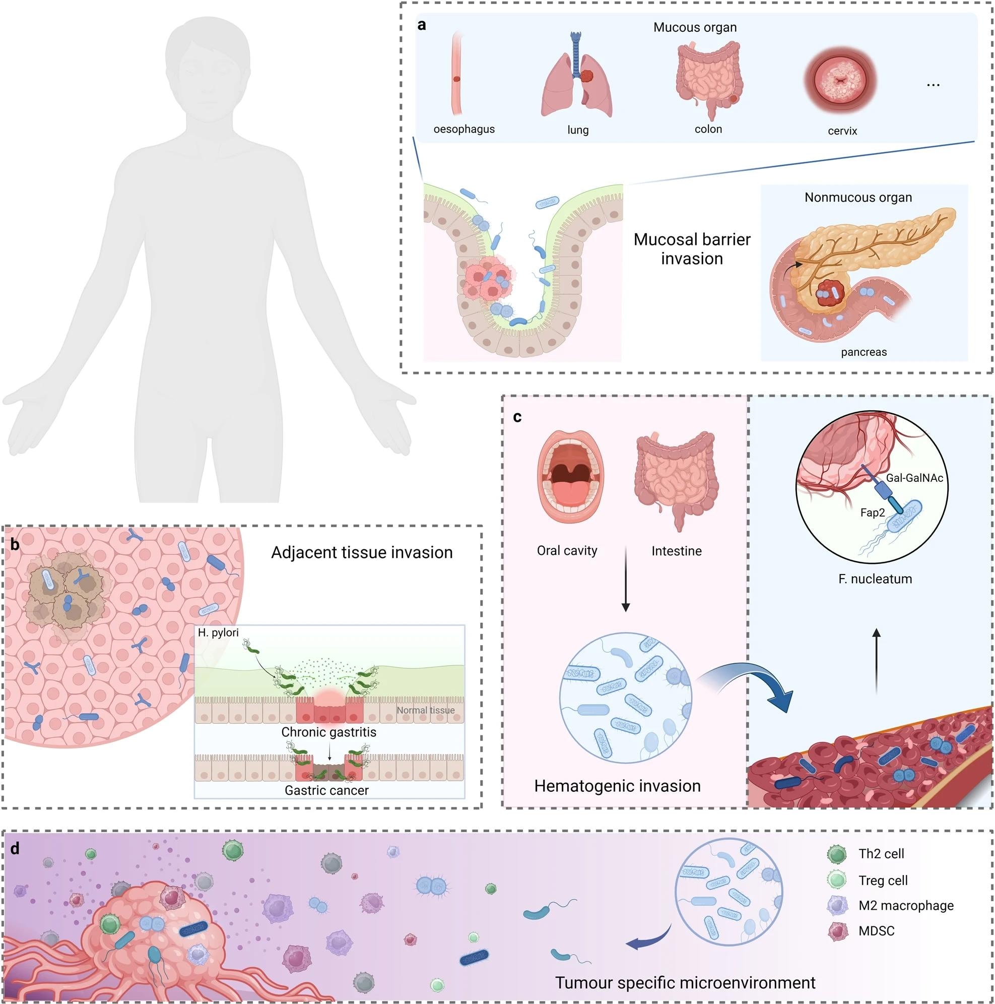 Over time, researchers identified various routes of invasion of microbes in tumors, of which four major ones are mucosal destruction, adjacent tissue migration, and hematogenic invasion. Once they invade the tumor microenvironment (TME), these microbes affect the biological behavior of tumors.