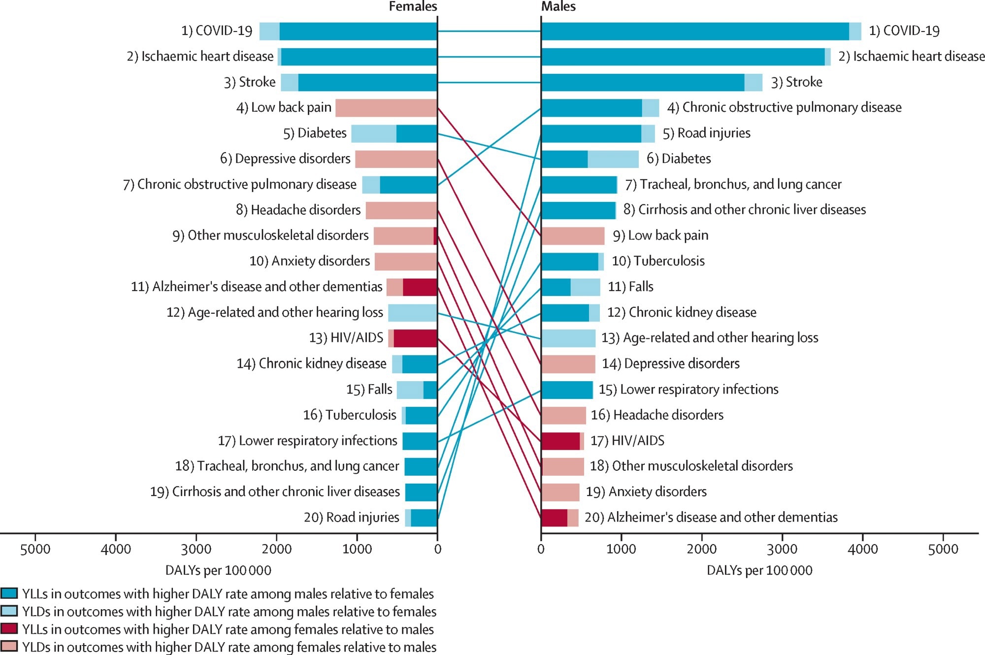 Among males, coronavirus disease 2019 (COVID-19) had the most significant absolute difference in 2021, with 1767.8 more DALYs per 100,000 males than females. Further, road injuries had the largest relative difference. For conditions wherein females had higher DALY rates than males, the differences between the two sexes emerged early in life. Conversely, for conditions wherein males had a higher burden than females, the differences between the sexes were minor at early ages.