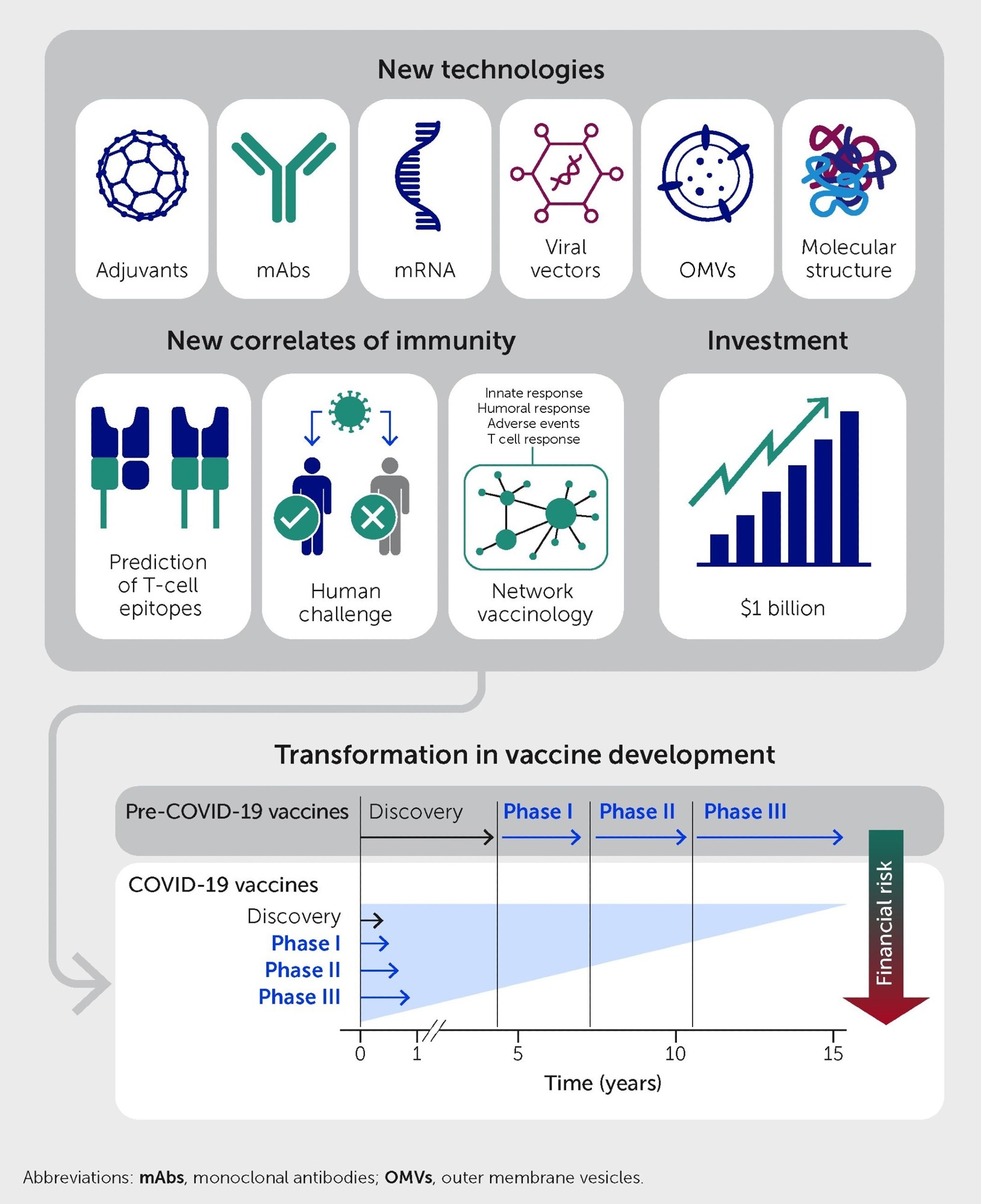 The COVID-19 pandemic radically changed the vaccine development process. Pre-pandemic, the development process entailed sequential phases of discovery, early-development, and phase I–III clinical trials over a period of 15 years or so. For COVID-19 vaccines, new technologies, new correlates of immunity, and early public investment allowed all steps to establish safety and efficacy to be completed in parallel within 10 months and with less financial risk to developers.
