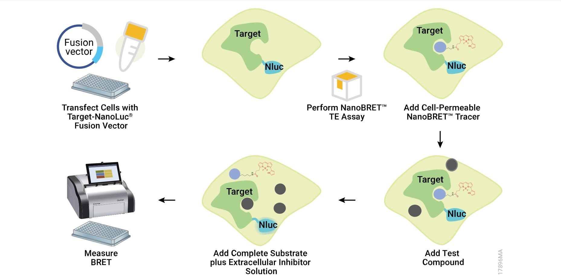 NanoBRET® TE is based on a specialized bioluminescence resonance energy transfer (BRET) technique. This method uses a NanoLuc® luciferase-tagged target protein expressed within the cell and a cell-permeable fluorescent tracer that binds to the target protein.