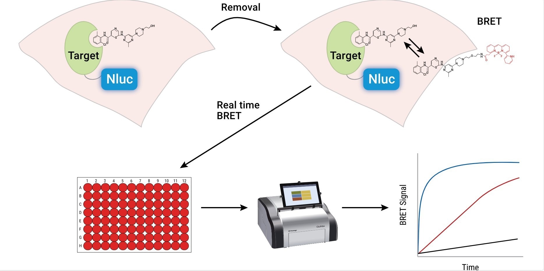To create quantitative assay conditions, the fluorescent tracer is added to cells at concentrations that are equal to or less than the dissociation constant (Kd) of the tracer. The initial binding of the tracer to the target provides a baseline BRET signal. Researchers then introduce unlabeled drug compounds under study, which can displace the tracer from the target protein, resulting in a reduction in BRET signal.