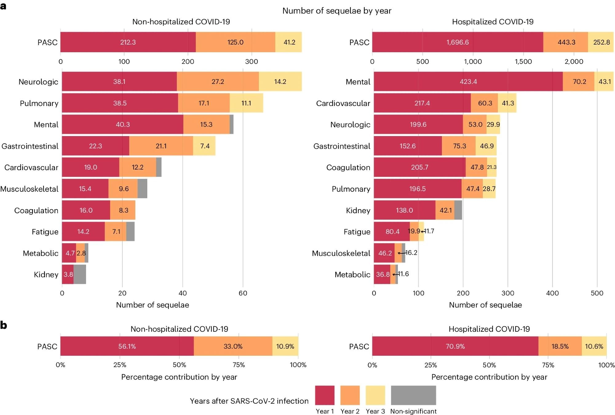 Furthermore, studies have reported that a quarter of the cumulative disease and disability burden associated with PASC is from the second year after the initial infection. However, follow-up data beyond two years are limited, and the risks of persistent PASC symptoms or emergence of new PASC-associated risks in the long term remain unclear.