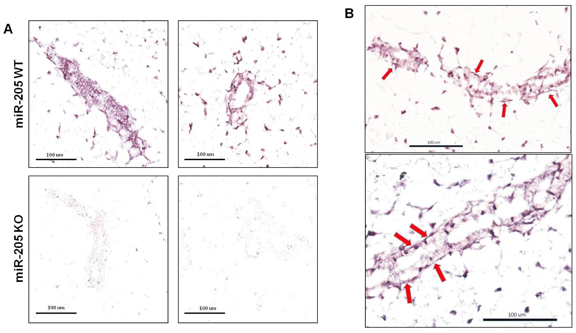 miR-205 expression and localization. In situ hybridization of miR-205 in mammary glands confirmed the loss of expression in KO mice versus WT (A); in addition, a more detailed evaluation revealed preferential localization of this miRNA in the mioepithelial cells ((B), red arrows). Images are representative. Study: Genetic Loss of miR-205 Causes Increased Mammary Gland Development.