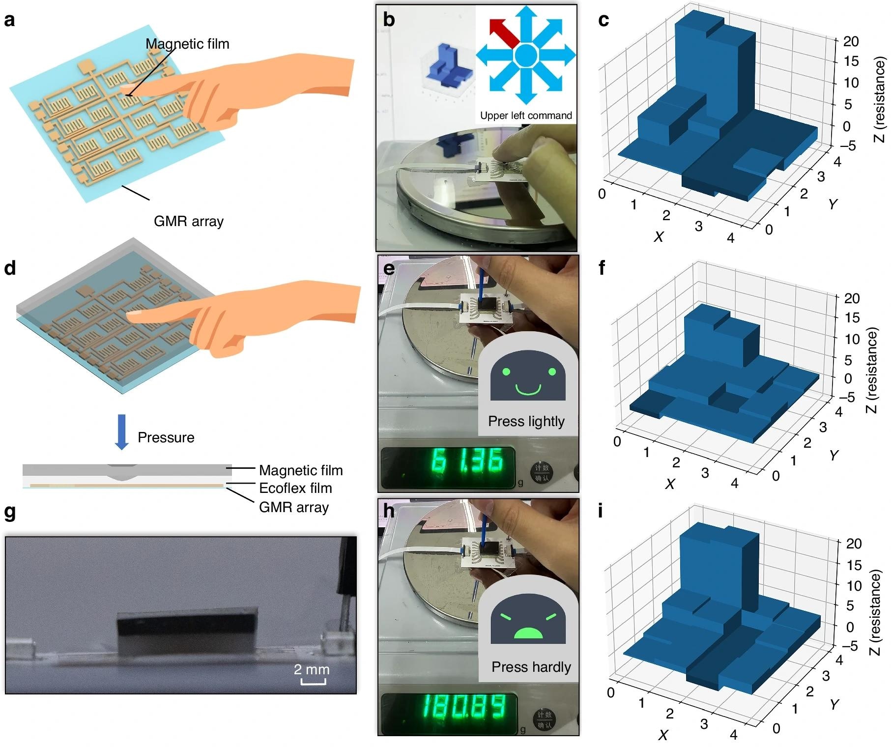 a Schematic image showing the touchless interactions using the flexible GMR sensor array. b Optical image of the flexible GMR sensor array and magnetic skin on a human fingertip. c Magnetic response of the GMR sensor array when a finger approaches the top left corner. d Schematic images showing the pressure sensing using the flexible GMR sensor array. e, h Optical images of the flexible GMR sensor array and magnetic skin when pressures of 61.36 g and 180.89 g are applied. g Optical side images of the pressure sensing installation. f, i Magnetic response when pressures of 61.36 g and 180.89 g are applieda Schematic image showing the touchless interactions using the flexible GMR sensor array. b Optical image of the flexible GMR sensor array and magnetic skin on a human fingertip. c Magnetic response of the GMR sensor array when a finger approaches the top left corner. d Schematic images showing the pressure sensing using the flexible GMR sensor array. eh Optical images of the flexible GMR sensor array and magnetic skin when pressures of 61.36 g and 180.89 g are applied. g Optical side images of the pressure sensing installation. fi Magnetic response when pressures of 61.36 g and 180.89 g are applied