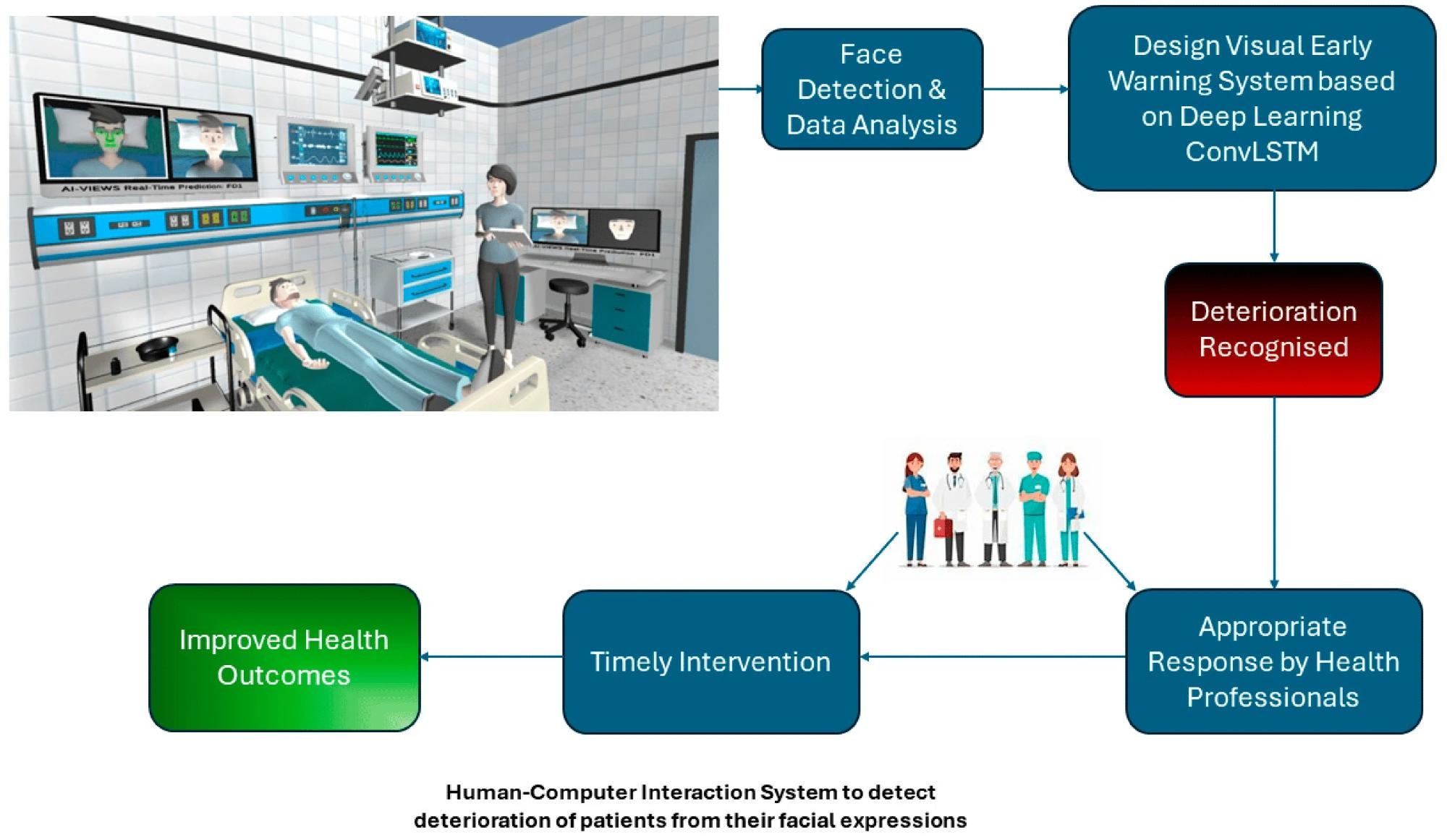 The model was trained on a synthetic dataset representing five specific facial expressions associated with deterioration risk. The system showed promising results, highlighting the potential of using advanced computer vision and machine learning techniques for early detection of patient decline.