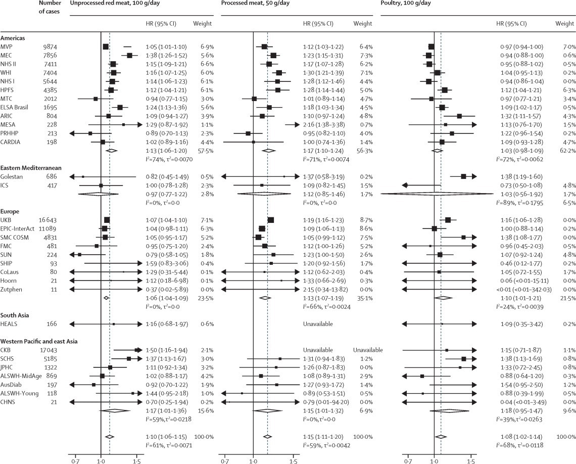 The consumption of unprocessed red meat varied greatly. For example, zero g/day of unprocessed red meat was reported in the Health Effects of Arsenic Longitudinal Study (HEALS) study conducted in Bangladesh, whereas 110 g/day was reported in the Coronary Artery Risk Development in Young Adults (CARDIA) study conducted in the U.S.